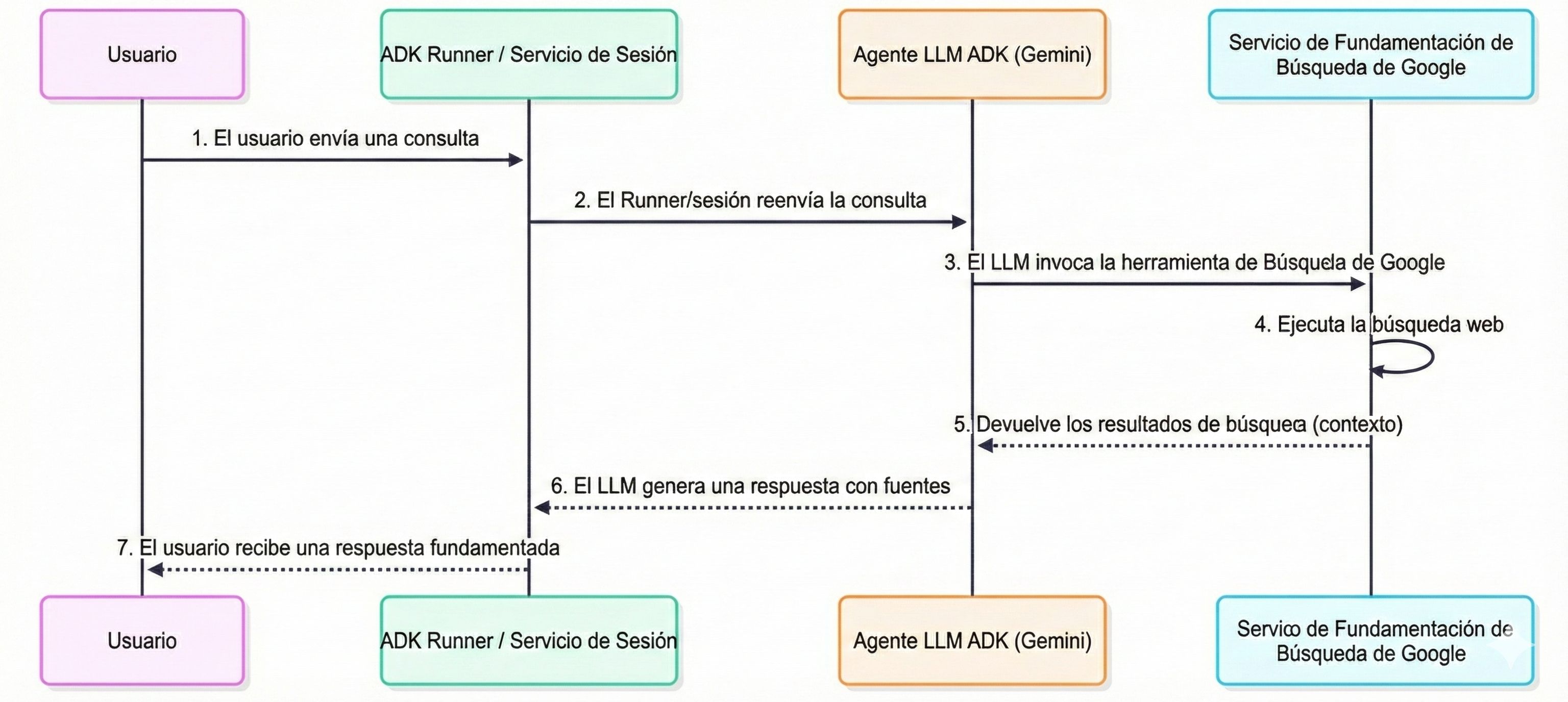 - Presentación de Respuesta con Fuentes : El ADK recibe la respuesta fundamentada final, que incluye las URLs de fuente necesarias y groundingMetadata, y la presenta al usuario con atribución. Esto permite a los usuarios finales verificar la información y construye confianza en las respuestas del agente.